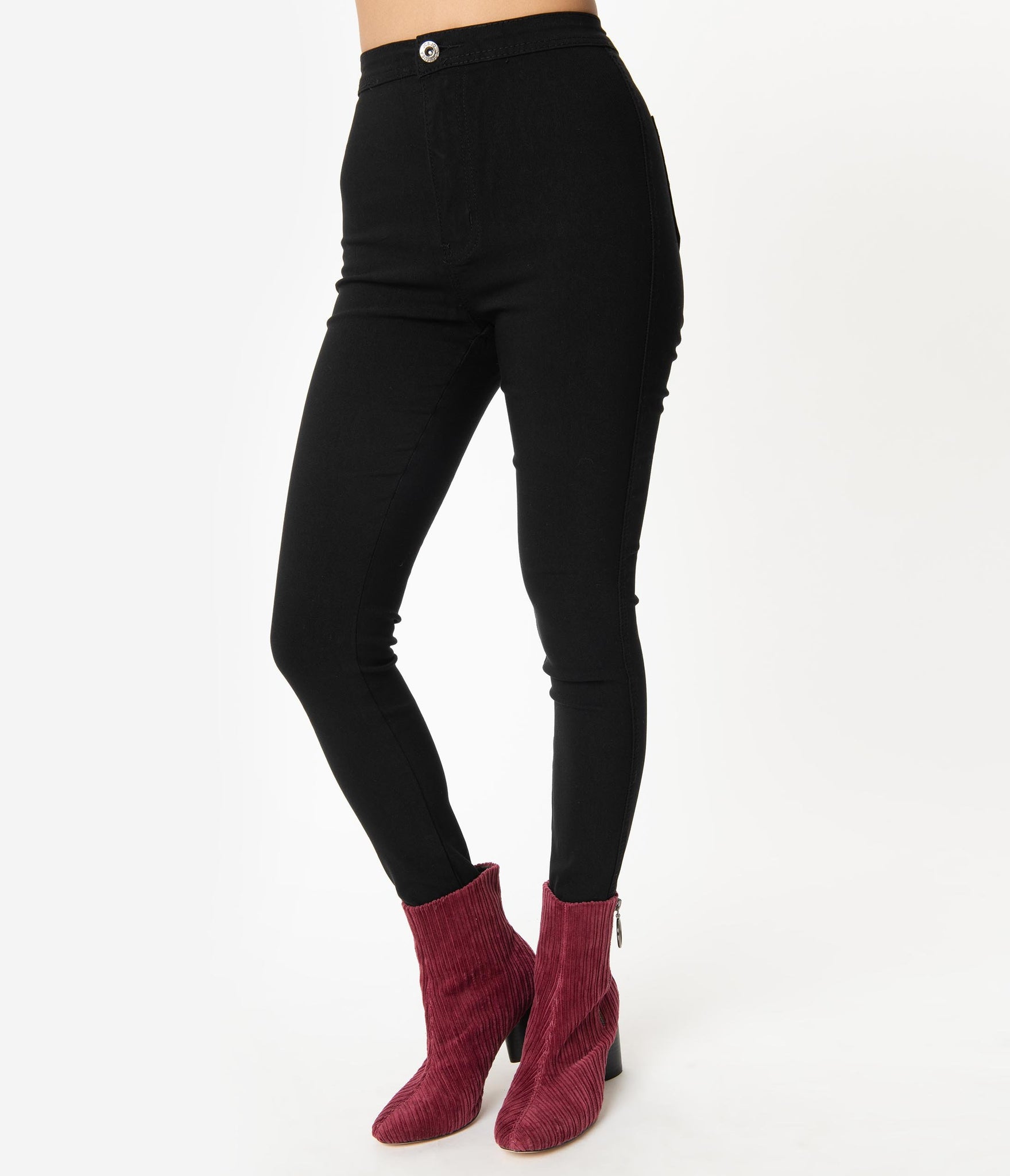You're a hot button, doll! A rapturously retro inspired pair of cigarette pants in classic black with a dash of stretch, outfitted in a sublime high waist design with a tapered leg. The banded high waist features a front zipper and button in classic jean design with twin back pockets. We think that about seams it up!