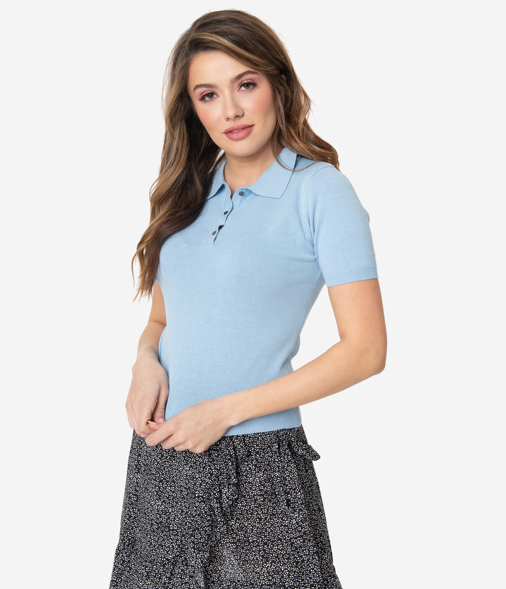A classic polo look! This knit top is cast in a light blue and imitates a classic polo shirt. Three buttons lead to the collar, while banded cuffs and waist add the retro style to this classic top. A stretchy cotton knit allows you to feel comfortable and look classic!