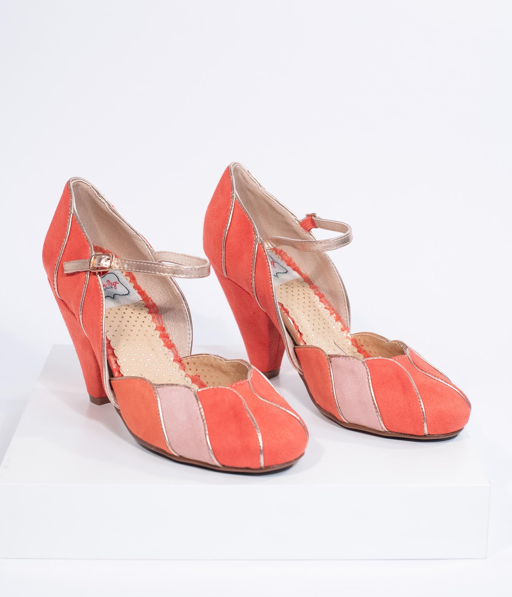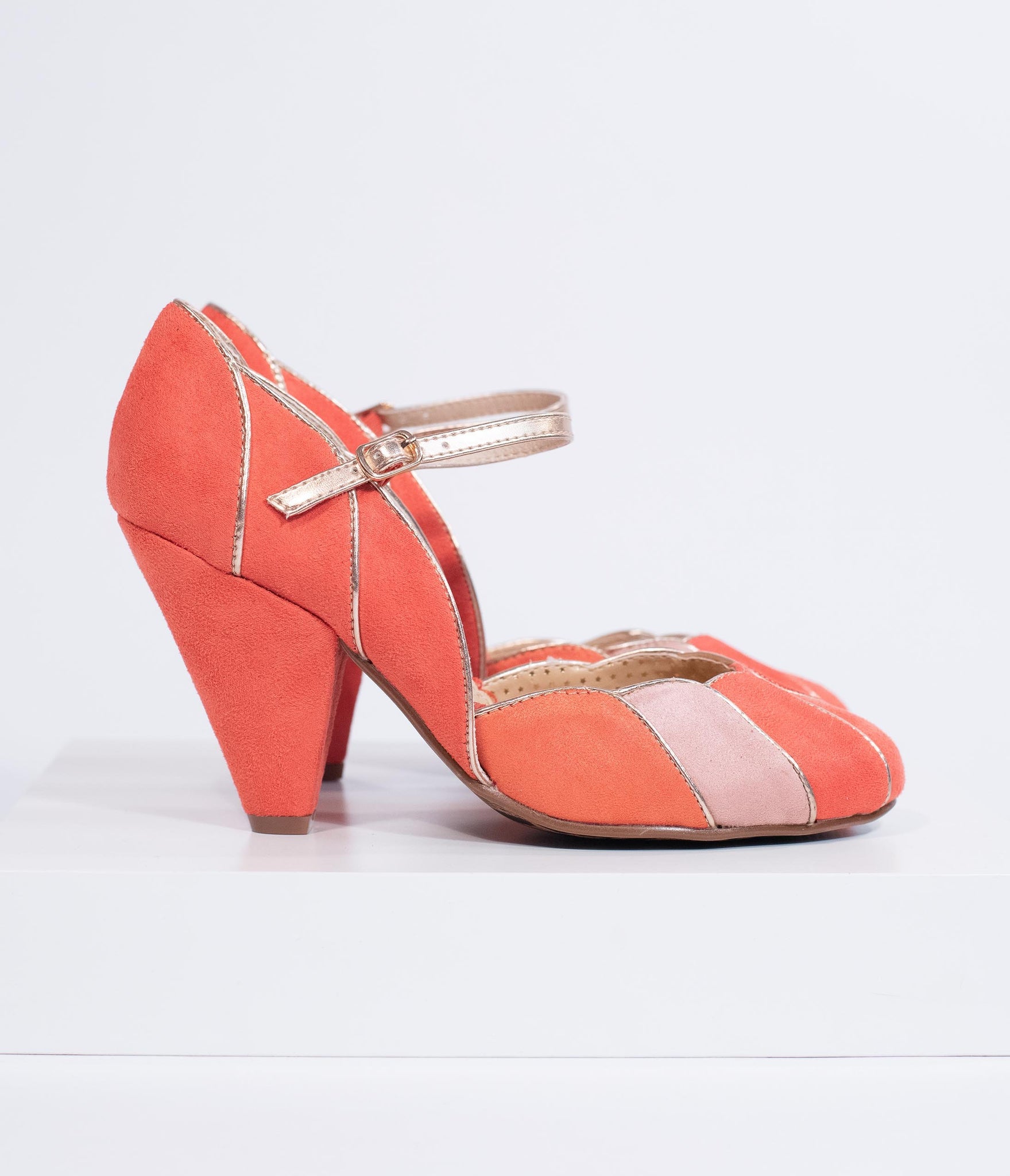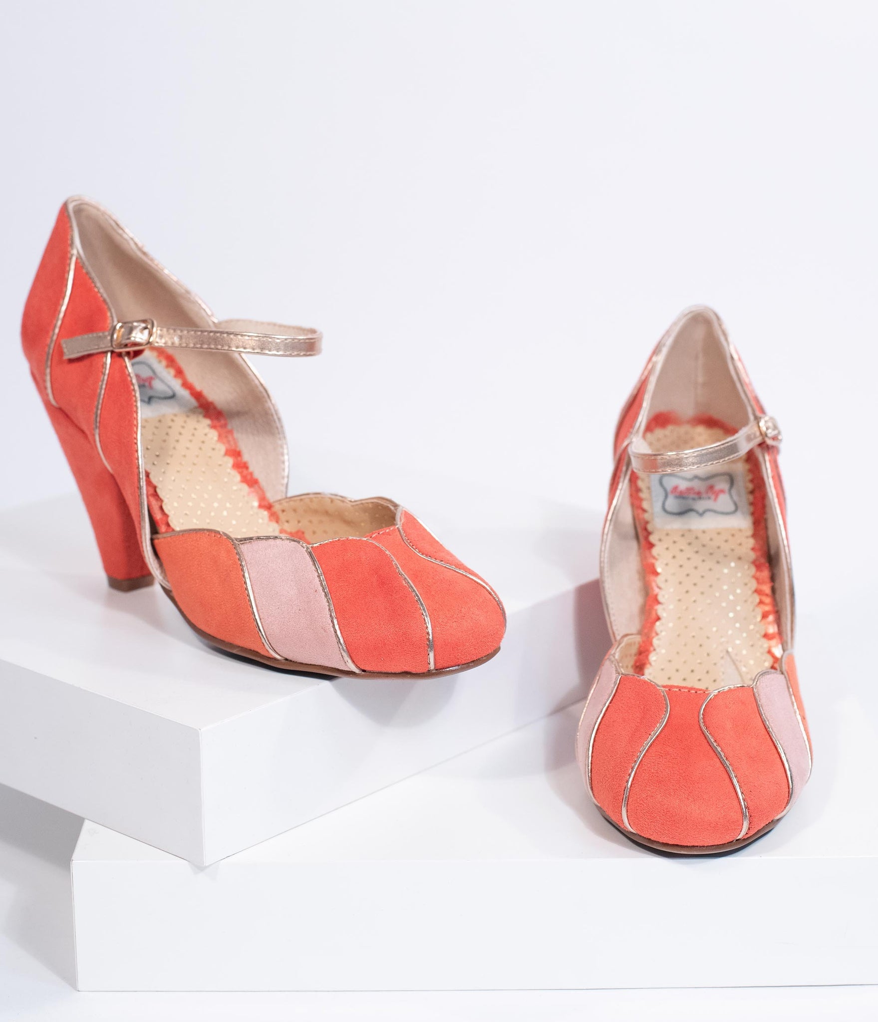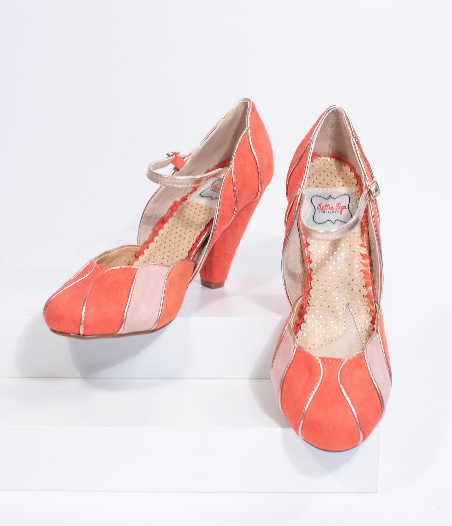 We've found the way to stand out, dames! A set of elegant peach pink pumps from Bettie Page and crafted in a soft faux suede. The Mary Jane design boasts a scalloped vamp with gleaming piping while the 4” heel provides a stunning lift. The adjustable and gored ankle strap lends a secure fit for a pair of vivacious vintage-inspired stunners!